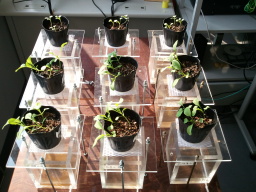 | 本研究では、水中気泡内放電により処理した水が植物の生育環境に与える影響について調べ、硝酸態窒素、亜硝酸態窒素が植物の生育に及ぼす影響、および水中に含まれる菌数の変化について検討を行っています。実際に、私たちのコマツナを用いた栽培実験において、生育促進、養液の殺菌効果が実証されています。 植物工場のような大型の生産施設において,有害菌の発生による被害を回避する方法を構築することは非常に重要であるため,培養液伝染性病害への対応は養液栽培の経営安定に不可欠であり,養液栽培の将来にもかかわる問題となっています。 |  |